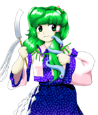 妖怪の山にある守矢神社に住む巫女さん。妖怪退治は不慣れ。普段は神様と妖怪達に囲まれて暮している為、人間の話し相手が欲し いと思っているが、麓の人間は妖怪染みた人間ばかり。 そのうち、自分のああなるのかと少しだけ心配している。 でも、現人神と慕われただけあって妖怪にも劣らないが、少々惚けた 所もある。 神奈子に言われて妖怪退治の真似事をしてみたり……幻想郷に慣れよ うとしている。